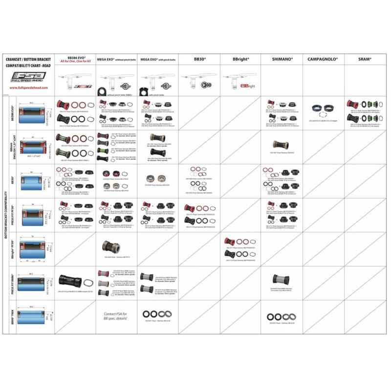 - Montage de pédaliers FSA MegaExo NBD, MegaExo Pinch Bolt, Shimano et SRAM GXP Road dans un cadre BB386EVO