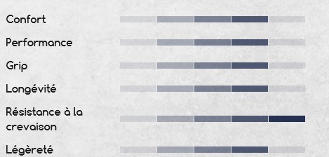 - Technologie "Hardskin" : couche de protection polyamide sur les flancs et sous la bande de roulement pour accroître la résistance aux agressions