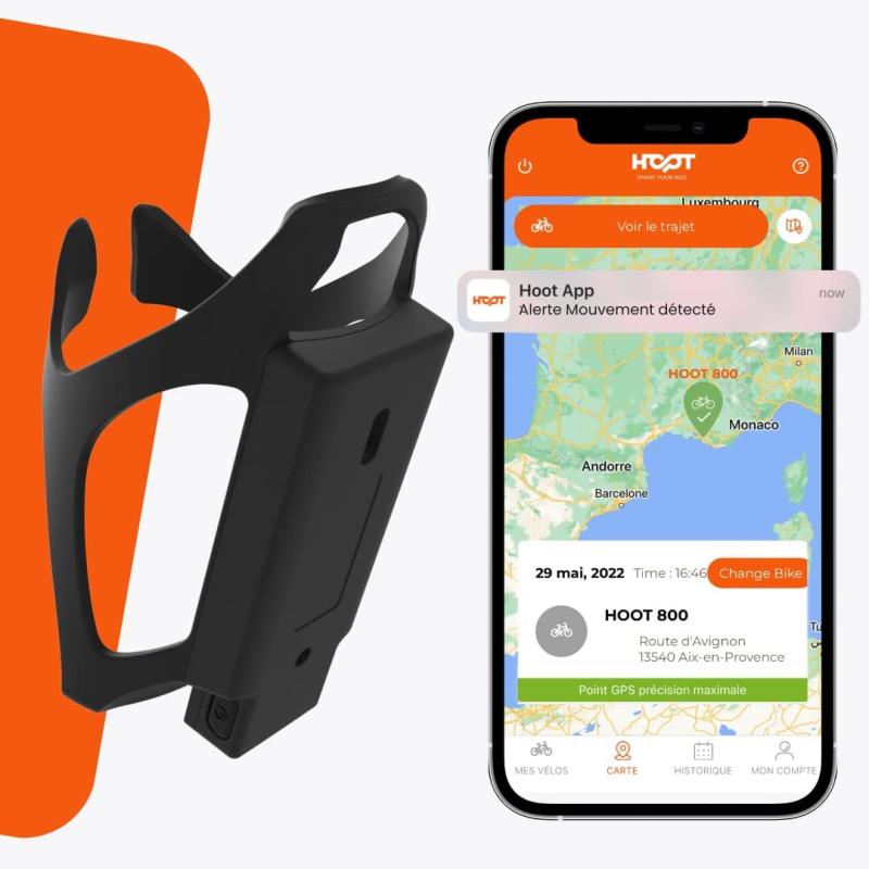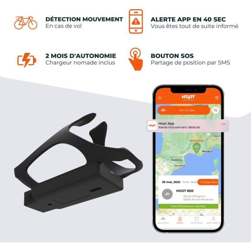 Dissimulé dans un porte-bidon, le traceur GPS HOOT 800, surveille votre vélo et vous alerte en moins de 20 secondes en cas de mouvement. En cas de chutes ou d’impacts, son bouton SOS déclenche un sms qui alerte vos proches de votre position.