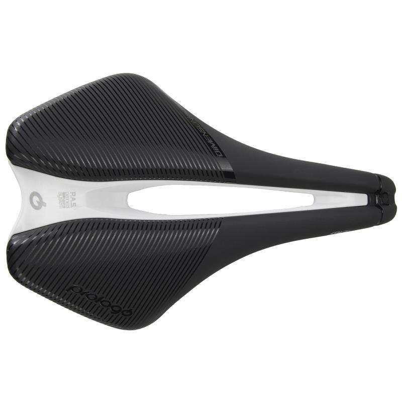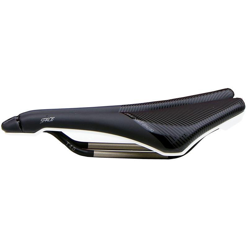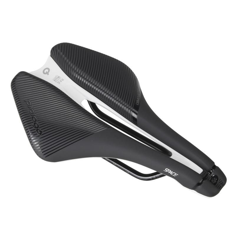 La selle PROLOGO Dimension Space 4.0 est un modèle à part dans la gamme du fabricant, caractérisé à la fois par une très grande largeur (153 mm), une longueur réduite et un bec très court (30 à 35 mm de moins que sur les modèles classiques), tout cela dans le but d'offrir un niveau élevé de confort et de performance, en particulier pour les coureurs très sensibles au niveau du périnée.