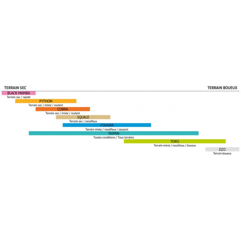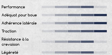 - Technologie "Hardskin" : Couche de protection polyamide sur les flancs et sous la bande de roulement pour accroître la résistance aux agressions