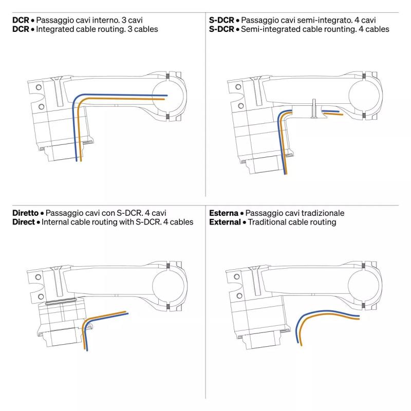 la potence DEDA Superbox propose une solution exclusive offrant deux options de montage. Le routage complet des câbles internes (DCR) ou le routage semi-interne des câbles (S-DCR) à travers un couvercle permettant l'installation, l'ajustement ou l'entretien sans complications inutiles pour les câbles électroniques et les gaines hydrauliques.