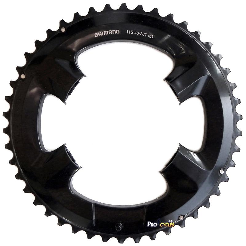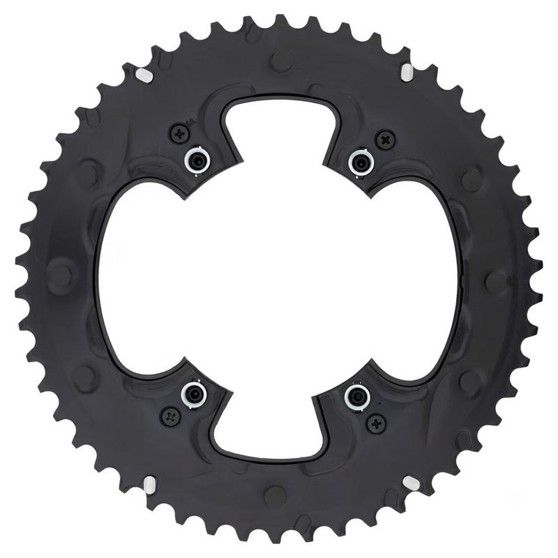 Le plateau 11 vitesses Shimano FC-RS510 a un cercle de trous de 110 mm avec perforation asymétrique. le plateau 46 dents est en composite aluminium-résine.